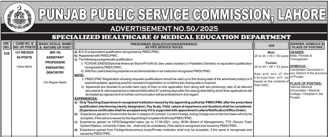 Primary Keywords: Apply for PPSC Assistant Professor Paediatric Dentistry (BS-18) Latest Jobs – Advertisement No. 50/2025. 2 regular positions for BDS graduates with FCPS/MS in Paediatric Dentistry or 4 years demonstrator experience. Valid PM&DC registration required. Hard copy submission within 7 days mandatory., PPSC Advertisement 50/2025, Paediatric Dental Faculty Jobs Punjab, BDS with FCPS Jobs, Dental Teaching Careers Punjab, PM&DC Registered Dentist Jobs, Government Dental College Faculty