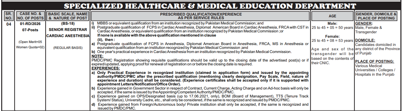 Secondary Keywords: BS-18 Medical Officer Jobs, Anesthetist Government Careers, PMC Recognized Jobs, PPSC Online Apply, Punjab Health Jobs, Specialist Doctor Recruitment, Cardiac Surgery Jobs