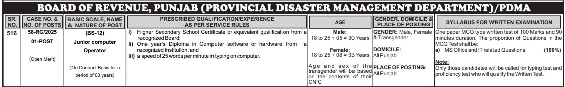 Posted Date: December 05, 2025 | Case No: 58-RG/2025 | Department: Board of Revenue, Punjab (Provincial Disaster Management Department/PDMA)