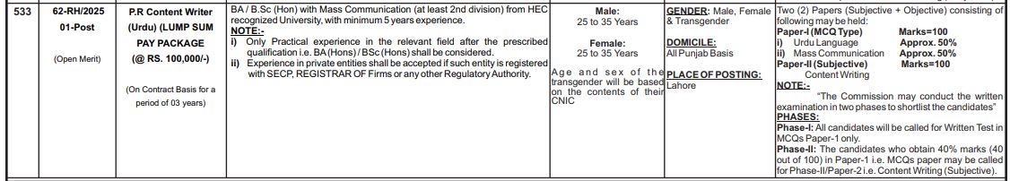 The Punjab Public Service Commission invites applications for a P.R. Content Writer (Urdu) to enhance the Punjab Police Department’s Urdu communication capabilities. With a prestigious lump sum package of RS. 100,000/- per month, this specialized role demands excellence in professional Urdu writing, strategic communication, and public relations tailored for Pakistan’s primary language audience.