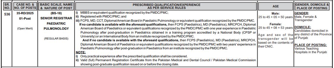 The Punjab Public Service Commission invites applications for Senior Registrar Paediatric Pulmonology (BS-18), a specialized clinical and academic position focusing on children’s respiratory health. This regular position offers paediatric pulmonology experts the opportunity to advance their careers in both clinical practice and teaching within Punjab’s leading teaching hospitals.